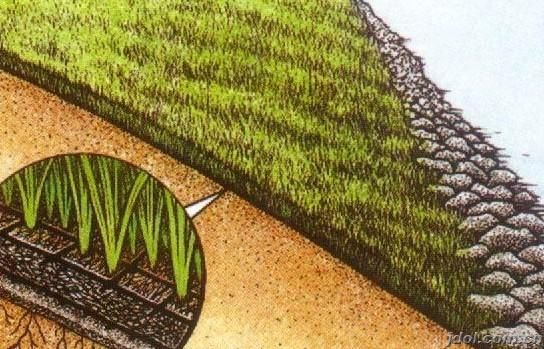 植被的抗侵蝕作用是通過它的三個主要構成部分來實現(xiàn)的:一是植物的生長層(包括花被、葉鞘、葉片、莖),通過自身致密的覆蓋防止邊坡表層土壤直接遭受雨水的沖蝕,降低暴雨徑流的沖刷能量和地表徑流速度,從而減少土壤的流失;二是腐質層(包括落葉層與根莖交界面),為邊坡表層土壤提供了一個保護層;三是根系層,這一部分對坡面的地表土壤加筋錨固,提供機械穩(wěn)定作用。一般情況下,在植物生長初期,由于單株植物形成的根系只是松散地糾結在一起,沒有長臥的根系,易與土層分離,起不到保護作用。而三維網(wǎng)的應用正是從增強以上三方面的作用效果來實現(xiàn)更徹底的淺層保護。一是在一定的厚度范圍內(nèi),增加其保護性能和機械穩(wěn)定性能;二是由于三維網(wǎng)的存在,植物的龐大根系與三維網(wǎng)的網(wǎng)筋連接在一起,形成一個板塊結構(相當于邊坡表層土壤加筋),從而增加防護層的抗張強度和抗剪強度,限制在沖蝕情況下引起的“逐漸破壞”(侵蝕作用會對單株植物直接造成破壞,隨時間推移,受損面積加大)現(xiàn)象的擴展,最終限制邊坡淺表層滑動和隆起的發(fā)生。